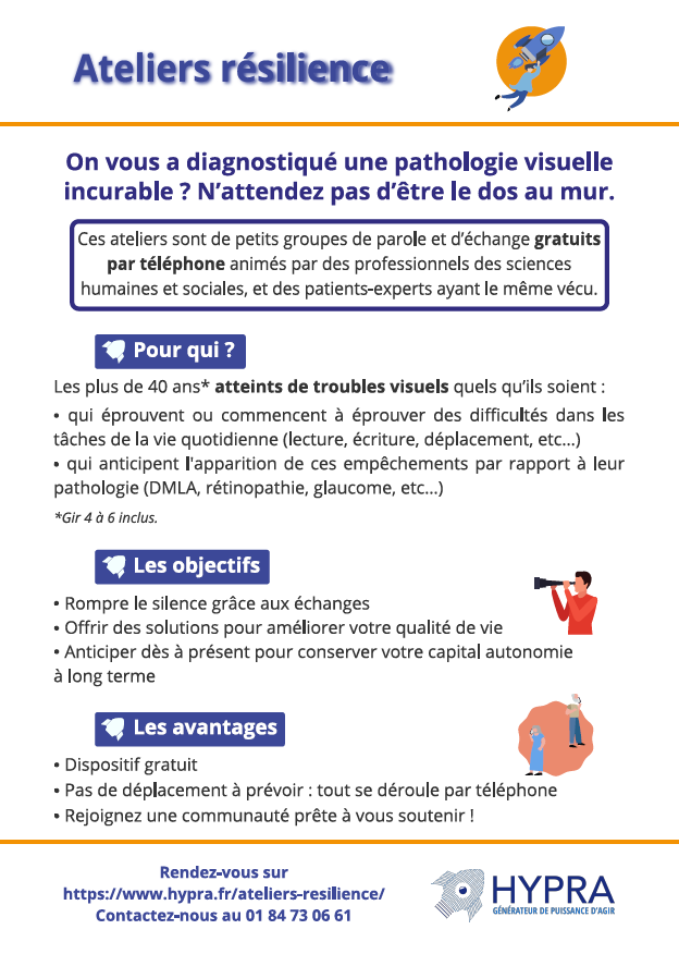 Lorsqu’une personne déficiente visuelle apprend que sa pathologie est incurable et/ou que sa vision va baisser, peu d’informations ou de conseils lui sont donnés. C’est en réponse aux angoisses et à l’isolement que cette situation peut créer, que Hypra met en place les ateliers résilience.
