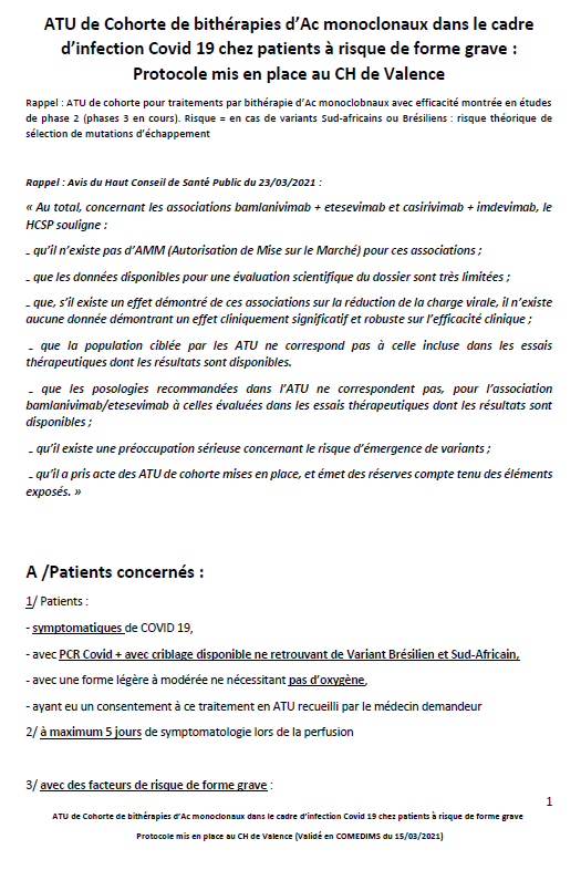 ATU de Cohorte de bithérapies d’Ac monoclonaux dans le cadre d’infection Covid 19 chez patients à risque de forme grave :