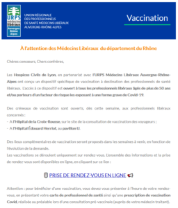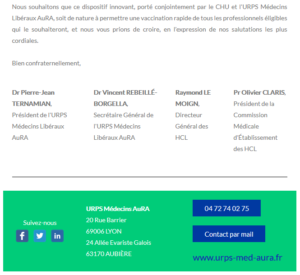 Nous souhaitons que ce dispositif innovant, porté conjointement par le CHU et l’URPS Médecins Libéraux AuRA, soit de nature à permettre une vaccination rapide de tous les professionnels éligibles qui le souhaiteront, et nous vous prions de croire, en l’expression de nos salutations les plus cordiales.