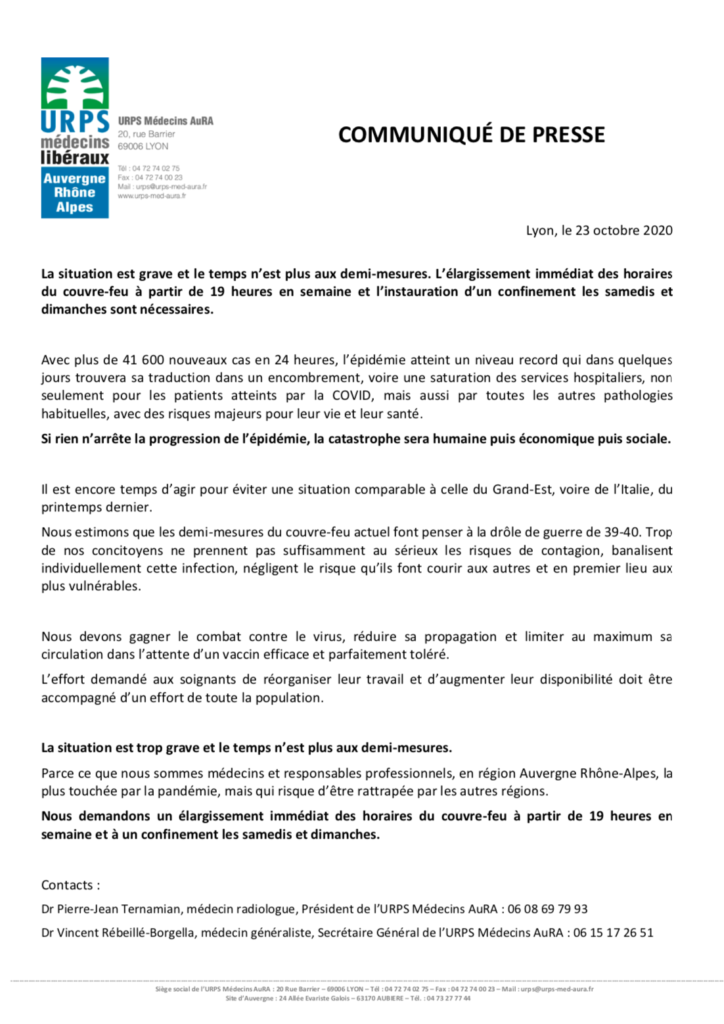 Dans un communiqué de presse, l’Urps Médecins Aura recommande vivement, un couvre-feu à partir de 19 heures en semaine et un confinement total les samedis et dimanches. L’effort demandé aux soignants doit être accompagné d’un effort de toute la population.