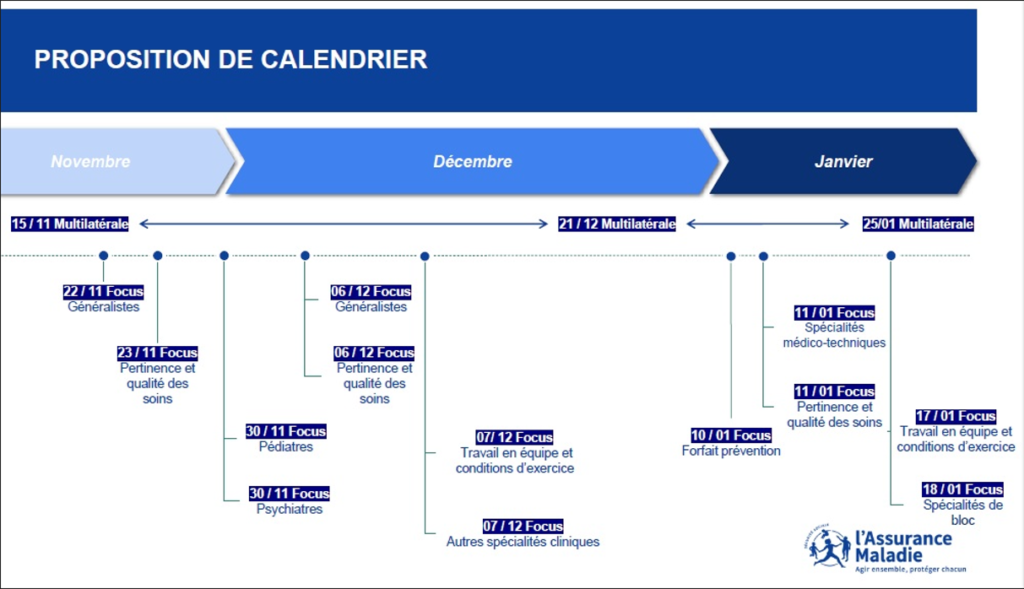 Les négociations pour la signature d’une nouvelle convention médicale ont débuté le 15 novembre, en présence de l’Uncam, de l’Unocam et des syndicats représentatifs des médecins libéraux : la Fédération française des médecins généralistes (MG France), Avenir Spé – Le Bloc (union d’Avenir Spé et du Bloc composé d’A.A.L, U.C.D.F et SYNGOF), la Confédération des syndicats médicaux français (CSMF), la Fédération des médecins de France (FMF), l’Union française pour une médecine libre (UFML) et le Syndicat des médecins libéraux (SML).