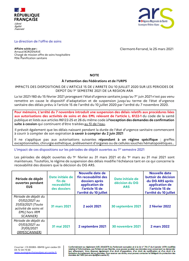 Nous vous prions de bien vouloir trouver ci-dessous, une note d’information concernant l’impact des dispositions de l’article 15 de l’arrêté du 10/07/2020, sur les périodes de dépôt d’autorisation des activités de soins et d’EML du 1ier semestre 20201 de la région AuRA.
