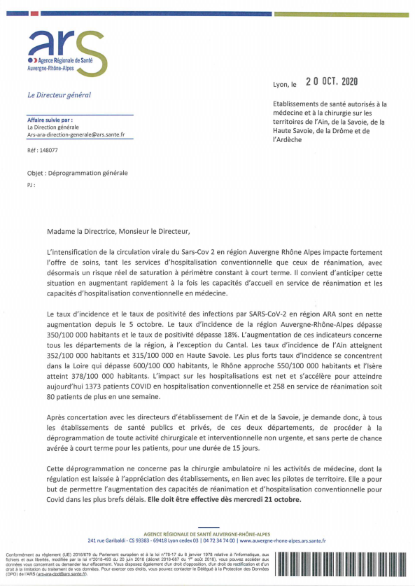 L’Ain et la Savoie visés par la déprogrammation générale pour une durée de 15 jours. Toutes les informations disponibles dans le courrier de l’ARS.