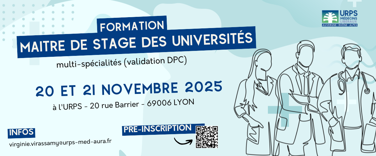 L’URPS Médecins Libéraux AuRA propose aux médecins de plusieurs spécialités* de participer à une formation Maitre de Stage des Universités (validation DPC) les 20 et 21 novembre 2025 à Lyon.