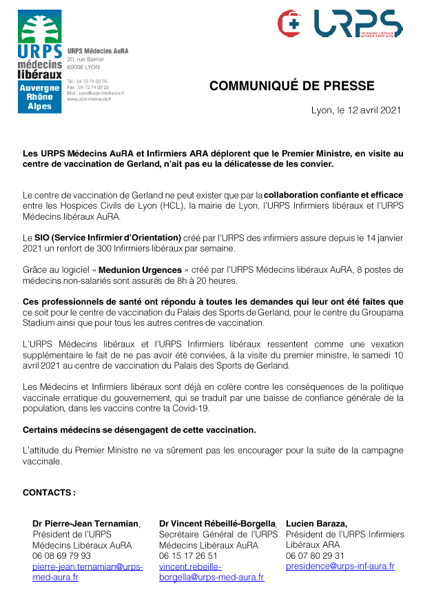 Les URPS Médecins AuRA et Infirmiers ARA déplorent que le Premier Ministre,