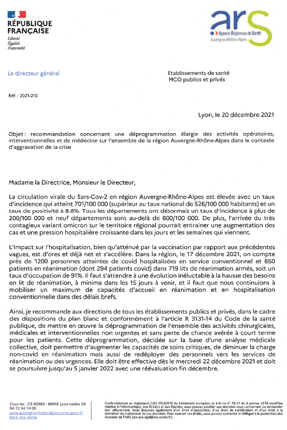 L’Agence régionale de santé d’Auvergne-Rhône-Alpes recommande une déprogrammation