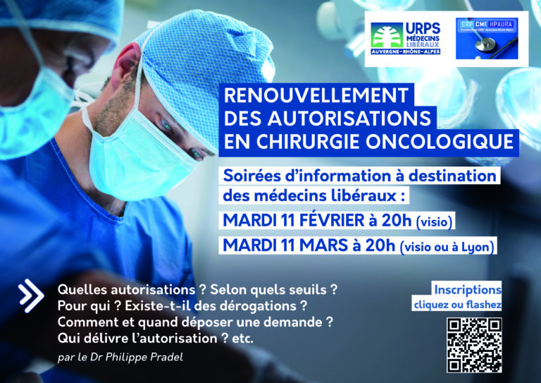 - L’URPS Médecins Libéraux AuRA vous invite à vous rapprocher de la direction de votre établissement et/ou de vos représentants à la Conférence Médicale d’Etablissement afin de savoir ce qui est envisagé dans votre établissement en matière d’autorisations en chirurgie oncologique.