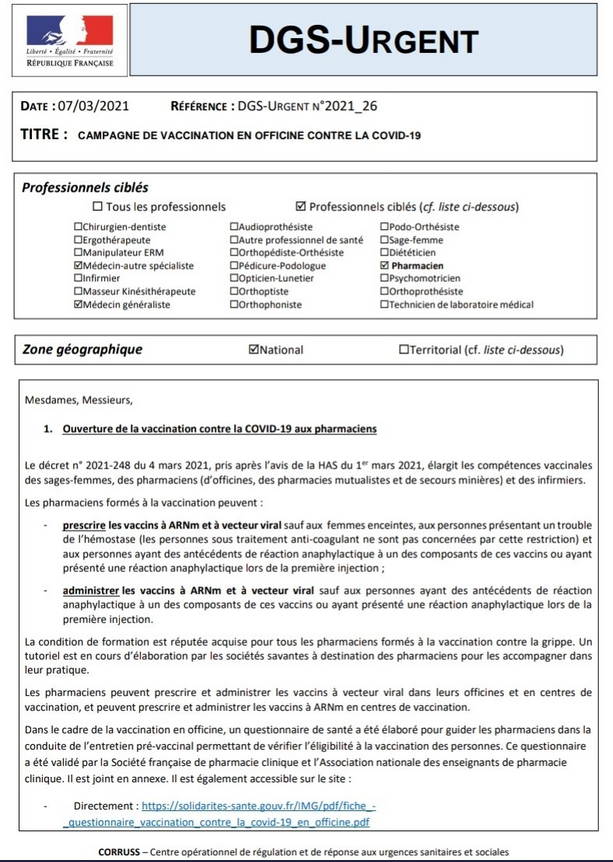 L’URPS Médecins Libéraux exprime son incompréhension devant l’envoi par la DGS hier soir, signifiant que la commande des vaccins pour cette semaine à venir serait réservée aux pharmaciens et interdite aux médecins généralistes.