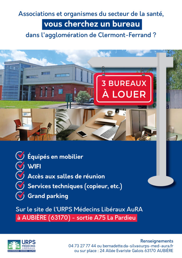 Des bureaux sont également disponibles à la location sur le site d’Aubière (63) de l’URPS Médecins, à disposition des associations ou organismes du secteur de la santé.