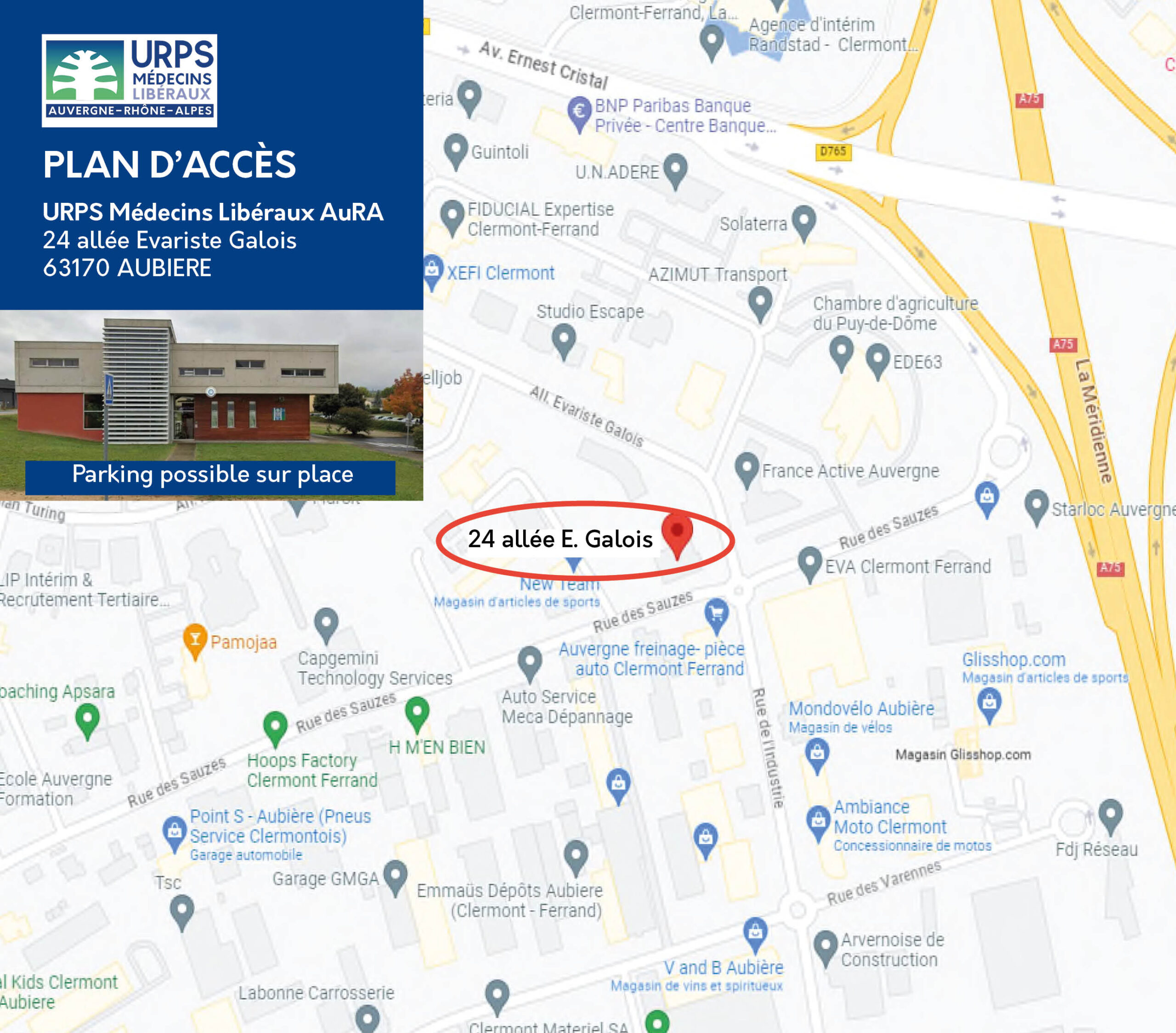 Des bureaux sont également disponibles à la location sur le site d’Aubière (63) de l’URPS Médecins, à disposition des associations ou organismes du secteur de la santé.