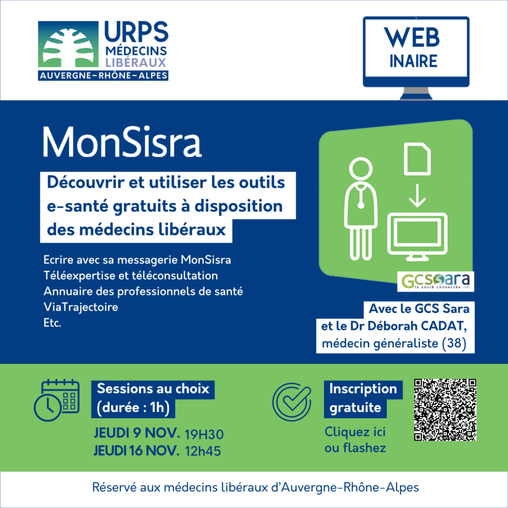 L’URPS Médecins Libéraux AuRA et le GCS Sara, concepteur de MonSisra, proposent aux médecins libéraux de la région un webinaire de présentation de MonSisra et des outils e-santé à leur disposition. La présentation sera assurée par les professionnels du GCS Sara avec la participation du Dr Déborah Cadat, médecin généraliste dans l’Isère.